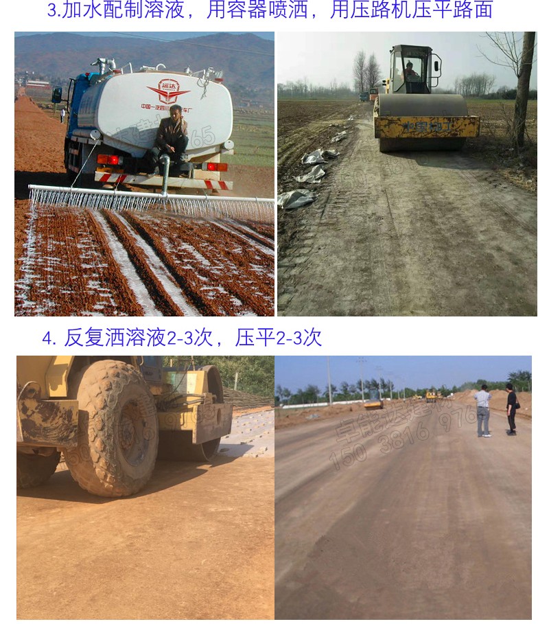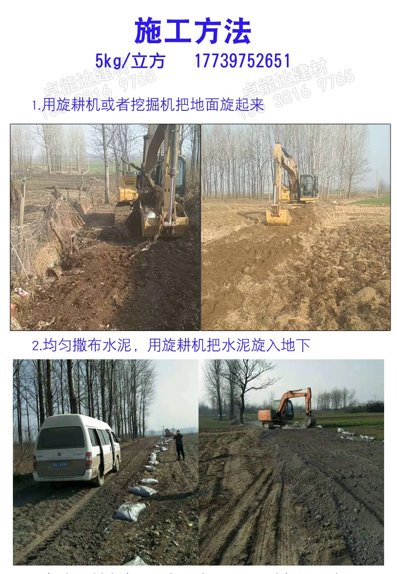 四:应用范围 1.各等级道路的基层及底基层的修筑。 2.场地平整及固化。如停车场、堆货场、运动场等。 3.土壤固化剂免烧砖。 4.水利工程中的堤坝填筑固化。 5.免做面层的原生态道路。适用于绿色生态园区、景区、农林牧区、高尔夫球场区等一切需要原生态路面的场所。 6.土壤固化剂墙体。这种墙体有温差小,散热慢,不怕水汽浸泡等特点,适用于各种大棚中墙体的修筑。 7. 修筑路基。高速公路的底基层硬化,一级路及以下各等级路的基层和底基层硬化。简易道路或临时性道路的基层和面层硬化。 8. 场地硬化。土地一级整理、停车场、堆料场、堆货场、生产加工场等场地的硬化处理。 9. 修筑夯土墙。如夯土墙蔬菜大棚、夯土墙养殖大棚、夯土墙民居、夯土墙豪宅别墅、夯土墙山庄会所度假村、夯土景观围墙、修补兴建土楼、夯土城墙及影视基地夯土外景、夯土碉堡炮楼等。 11. 水利堤坝/人工湖/围堰固化防渗 12. 矿井/油井固化防渗。 13. 矿山回填/垃圾填埋。 14. 尾矿渣处理。