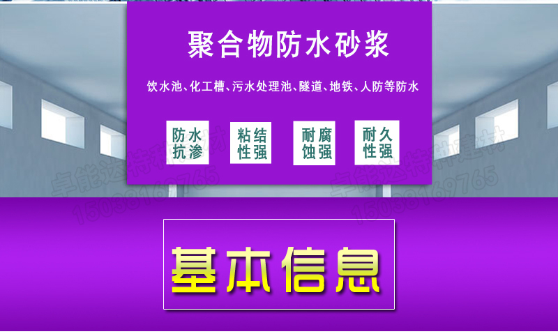 聚合物防水砂浆 本产品是由高分子聚合物、胶凝材料、细骨料、活性填料及其他功能性添加剂复合而成的新一代高性能防水材料,适用于工业与民用建筑的防水工程。 一、产品特点 1、防水抗渗效果好 二、应用范围 1、外墙面、屋面、地下室、桩基等部位的防水、防渗工程