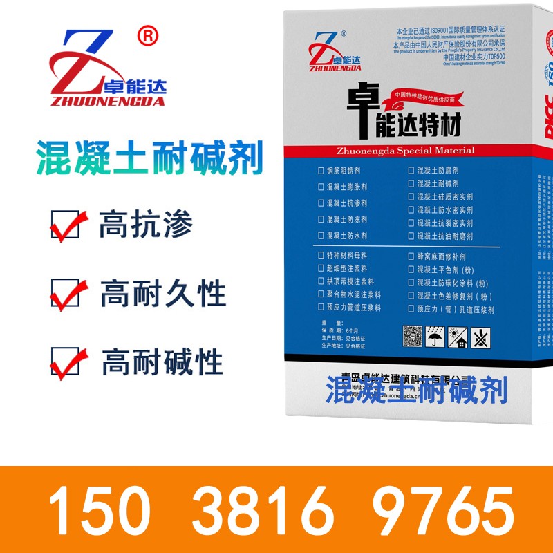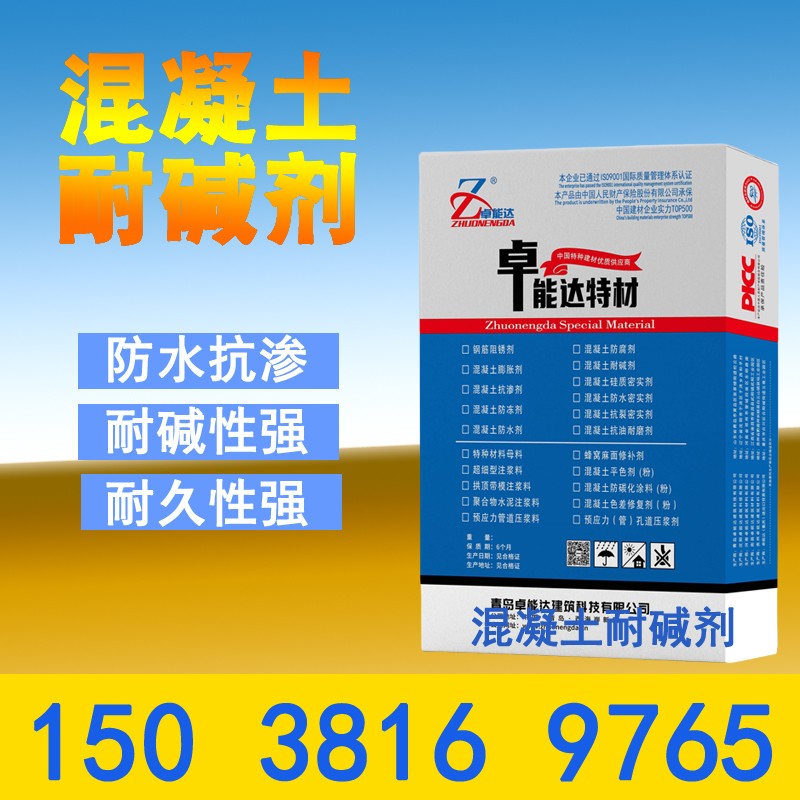 混凝土耐碱剂 一、产品简介 混凝土耐碱剂,是一种新型混凝土添加剂,该添加剂由多种有机添加剂混合而成, 1、高抗渗:抗渗标号可提高到P20~P35。 2、高耐久性:抗冻标号可提高到F150。 3、高耐碱性:耐碱腐蚀能力。 耐碱腐蚀能力提高5~30倍。通过添加耐碱物质,使混凝土内水化产物的化学环境更加合理, 通过添加超微细粉和防收缩物质,使硬化后的混凝土结构更加密实稳定,增强了耐碱混凝土抗物理腐蚀的能力。 4、水泥适应性强:能适应多种水泥及混凝土配合比的变化。 5、产品设计合理:可以根据不同季节提供缓凝型,早强型和防冻型产品。