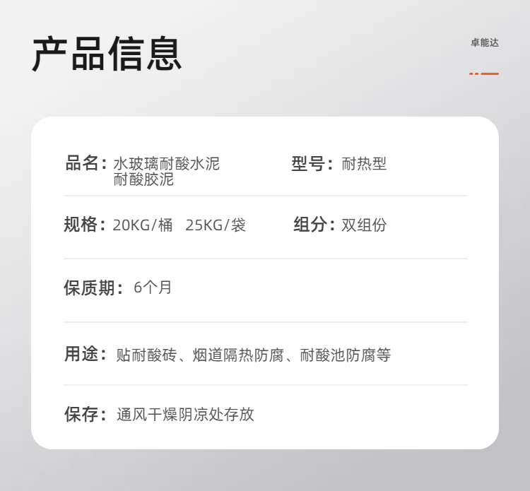 (1)耐酸性能,耐大多数的无机酸、有机酸、呈酸性反应的盐类(含氟酸及其盐类除外),各种氧化性介质(如:氯气,双氧水等)。 五、包装储运 1. 本产品为双组份:20KG/桶、25KG/袋。 2. 宜放置在室内5~25℃、阴凉、干燥、通风处保存。