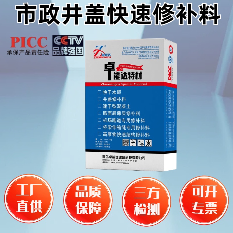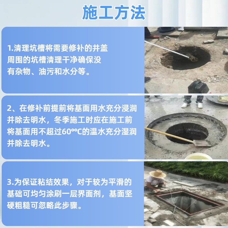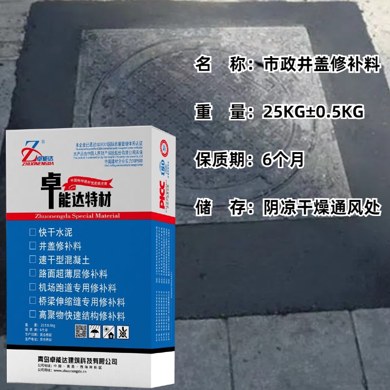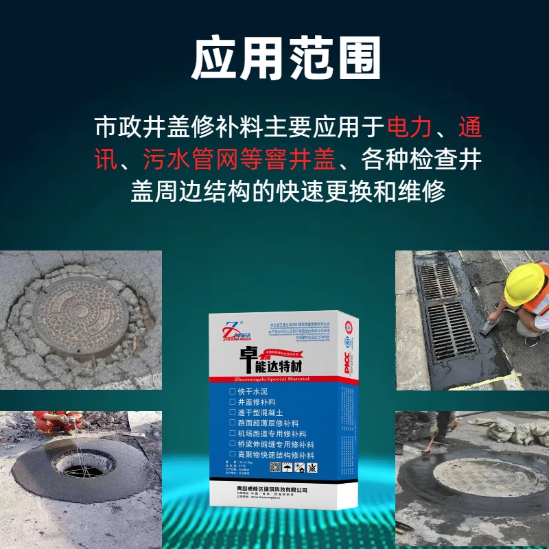 市政井盖专用修补料 一、产品简介 城市道路路面上各种检查井周边材料在车辆频繁碾压下,经常出现过早损坏的现象,给行人和车辆带来严重的安全隐患,井盖安全性维护是市政路面养护工作中的重点和难点,针对此问题,我公司组织技术人员研发了井盖周边结构修补专用料。材料由特种优质水泥、活性填料、高分子聚合物、高强纤维、优质外加剂等复配而成。主要应用于电力、通讯、污水管网等窨井盖、各种检查井盖周边结构的快速更换和维修。 二、应用范围 市政井盖专用修补料主要应用于电力、通讯、污水管网等窨井盖、各种检查井盖周边结构的快速更换和维修。 三、产品特点 1.早强性。市政道路车流量人流量大,不宜长时间封闭交通,一般市政维修在夜里12点以后,凌晨需要开放交通,因此维修材料需要快速凝固。此修补料速凝早强,使用后可迅速开放交通。 2.粘结强度高。井盖修补材料需要与原路基材料要有良好的匹配性和适应性,需要材料的粘结性、抗压性、抗折性等性能表现突出。否则,经过车辆碾压后,很容易造成二次脱落,费时费工。该修补料添加的功能性助剂可使其粘结性能表现更佳。 3.防水抗渗性优良。市政井盖周围一般为沥青料和混凝土材料,如修补材料的防水抗渗性差,雨水浸入后会造成修补结构不密实,很快再次破损。该修补料添加的高分子聚合物和活性填料在结构内部交联缠绕形成膜结构,且增加了密实性,防水抗渗性能优良。 4.耐久性好。材料本身有较好的防水、耐腐蚀和抗紫外线能力,对各种恶劣工况适应性较强,耐久性耐候性好。 5.不开裂、不收缩,可在潮湿基础上施工。 6.颜色可调,可根据要求,提供原色或黑色修补料。 五、包装储运 纸塑复合袋包装,25公斤/袋。阴凉、干燥、遮光处储存,除做好防雨外,可按一般货物运输。
