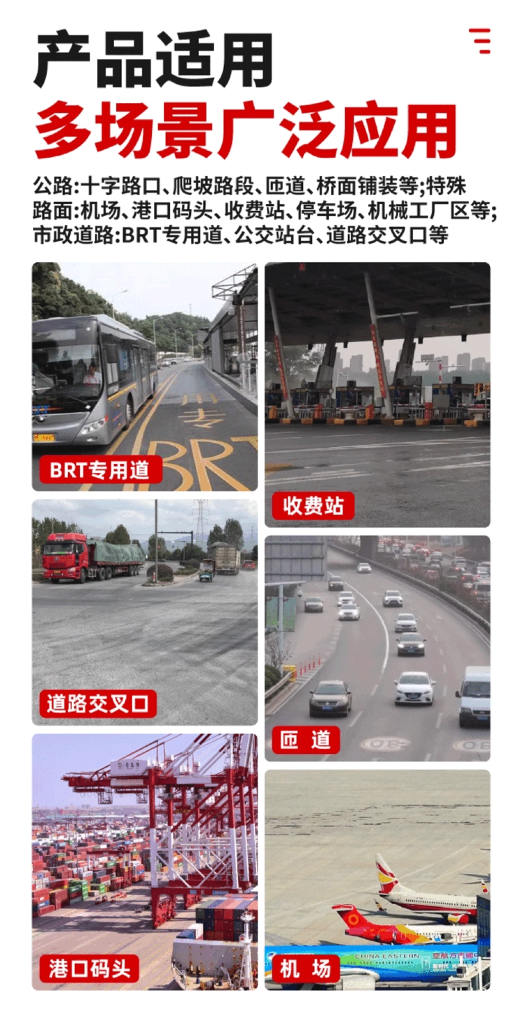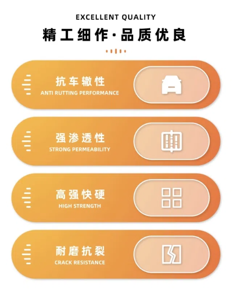 2、早强,不收缩,不泌水,不开裂。 4、路面强度高。大空隙率沥青路面空隙率高达20%-30%,半柔性灌浆料利用自身高流动性充分填充填充空隙,灌入率达到80%以上,使路面整体孔隙率大幅减少,且使原结构内空隙连贯一体,密实度增加,承载强度提高,不易产生车辙。 5、施工方便,直接加水拌合均匀即可灌注。可根据需求定制早强型。 三、适用范围 重载道路、收费站、加油站、匝道等爬坡沥青路段的表面灌浆处理。 五、施工注意事项 1、母体沥青混合料拌合要均匀,严格掌握沥青和集料的加热温度和混合料出场温度,运输到现场温度不低于120℃, 2、母体混合料的运输车底板侧板要涂抹隔离剂或防黏剂,运输过程中要覆盖篷布,起到防止热量散失、防止雨淋、防止污染环境的作用。 3、摊铺过程要做到均匀、缓慢、不间断,严格控制平整度,摊铺速度根据摊铺厚度、摊铺宽度和配套机械等因素综合确定,大约控制在2~6m/min范围内。 4、母体沥青混合料的铺筑同普通沥青混合料一样碾压工艺分为初压、复压和终压三个阶段,其具体碾压工艺为:初压使用12t钢轮压路机碾压1遍;复压采用静压法碾压1~2遍;终压使用<7t钢轮压路机进行收光。要求压实度控制在95%~100%。 5、灌浆料拌合时,拌合设备转速不低于 1000 r/min,应严格按照产品要求的用水量加水。待母体沥青混合料温度降到40℃以下方可进行灌浆,将拌合好的灌浆料在多孔基体沥青混合料表层进行摊铺,使用橡胶路耙反复拖拉使其自然浸透,必要时辅以小型振动机辅助浆料贯入,最后用路耙将残余表面的浆料清理干净,暴露出沥青混合料,保证沥青混合料骨料表面的凸凹性,增加路面的抗滑性。 6、施工气温在30℃以下时,不需要特殊的养护方式,只需常温下养护2~3d即可;当施工气温在30℃以上时,需要采用塑料薄膜进行覆盖养生或其他保湿养护方法养护3天以上。如灌浆料属于早强型,则可在湿法养护数小时砂浆完全硬化后开放交通。 六、包装与储运 采用纸塑复合袋包装,40Kg/袋,阴凉避光防潮保存,常规运输。