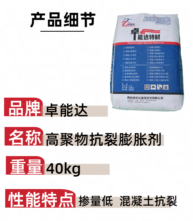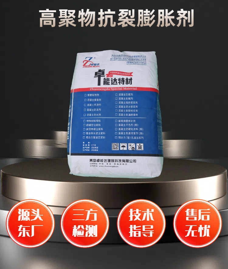 高聚物抗裂膨胀剂 一、产品简介 高聚物抗裂膨胀剂是在第四代混凝土膨胀剂生产技术基础上研制成功的新型混凝土膨胀剂,产品的显著特点是低掺量、低碱含量和高性能化。可有效地防止混凝土的开裂,使钢筋混凝土的整体结构和防水质量得到根本的提高,从而实现混凝土的结构自防水和结构的无缝施工。 二、性能特点