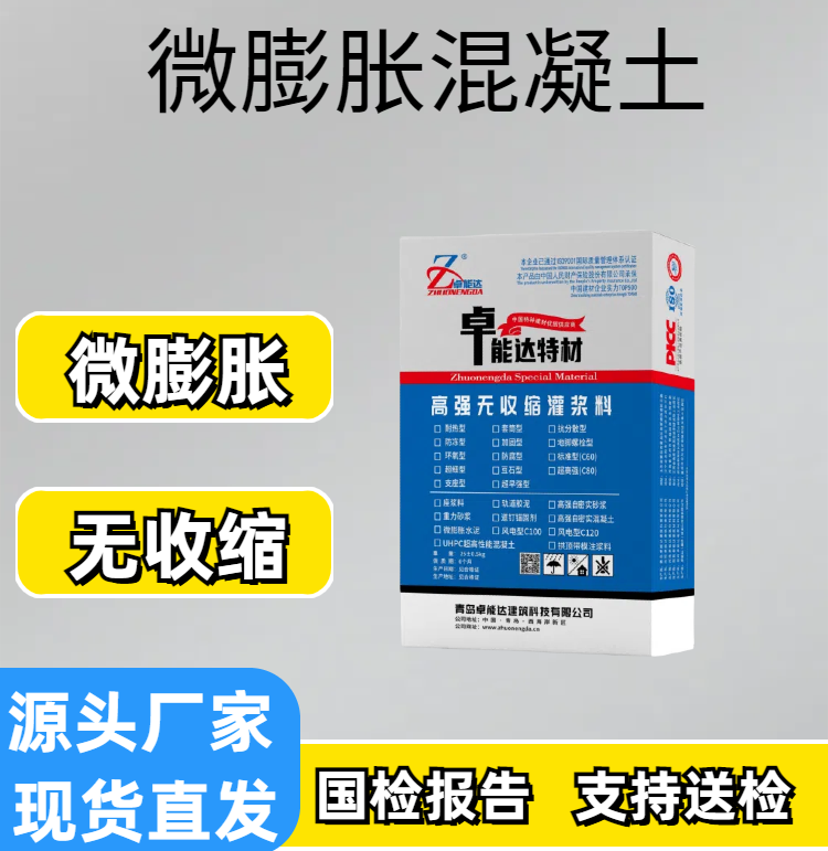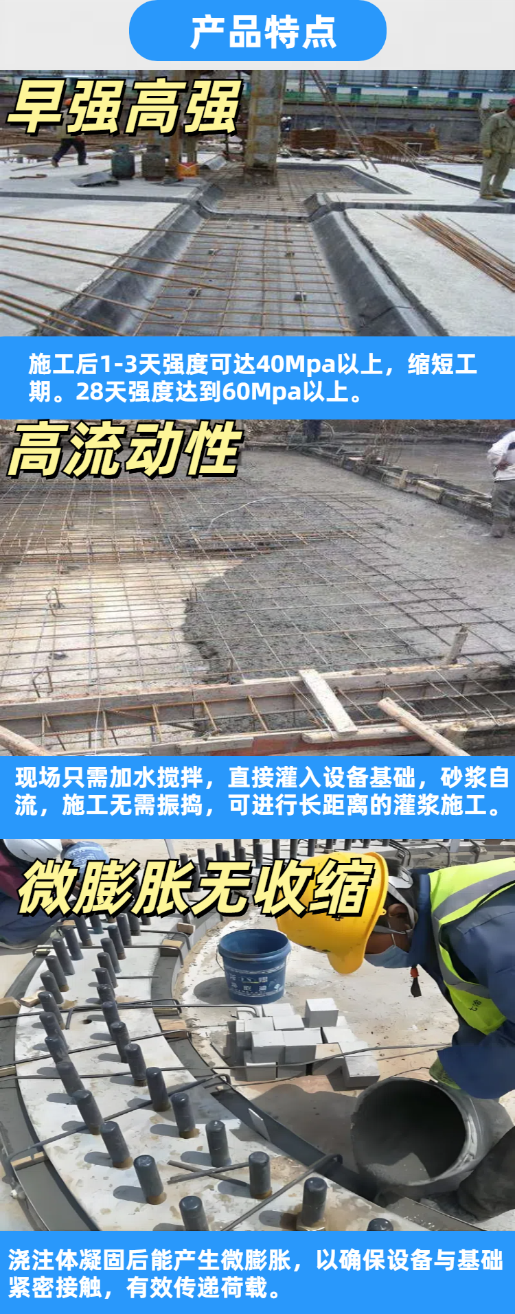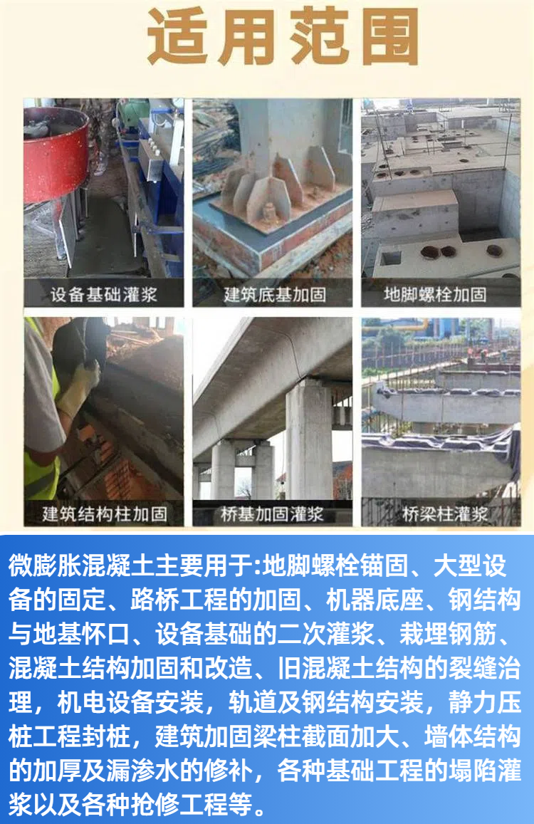 微膨胀混凝土 微膨胀混凝土是以高强石英砂作为骨料,以水泥作为结合剂,辅以高流态、微膨胀、防离析等物质配制而成。施工现场加入适量的水,搅拌均匀后即可使用。具有自流性好、早强、高强、无收缩、微膨胀、自密性好、防锈等特点。能改变设备底座受力情况,使之均匀地承受设备的荷载,从而满足各种大型机械设备或其他灌浆场景的设计要求。 二、应用范围: 1、 需高精安装的设备设备基础的一次灌浆和二次灌浆。 2、 钢筋栽埋及建筑、岩土工程的锚杆锚固。 3、 建筑加固改造工程,梁柱接头、变形缝、施工缝浇筑。 4、 道路、桥梁、隧道、机场等工程抢修施工。 5、 铁路轨枕的锚固施工。 6、 柱子包钢加固。 三、性能特点: 1.早强高强:灌浆后1-3天强度可达40Mpa以上,缩短工期。28天强度达到60Mpa以上。 2.自流态:现场只需加水搅拌,直接灌入设备基础,砂浆自流,施工无需振捣,可进行长距离的灌浆施工。 3.微膨胀: 浇注体凝固后能产生微膨胀,以确保设备与基础紧密接触,有效传递荷载。 5、 防水抗渗:防水性能强, 抗渗强度高。 6、 耐久性好: 200万次疲劳试验强度无明显变化。 五、 包装储运: