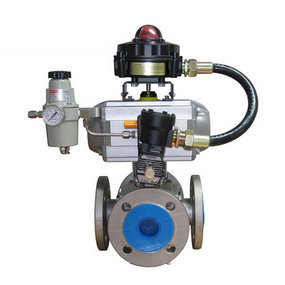 气动四通球阀可同时对两种介质的流向进行切换,替代了以前四个阀门的复杂操作,解除了所占空间大、成本高、操作烦琐等问题,实现一阀多用的效果。气动四通球阀为X形垂直通道,它的特点是球体的两条通道为X形布置,四个通道口径均布于球体赤道圆周截面上,当球体沿顺时针旋转90时,能使相对的两个通道实现两两互通。