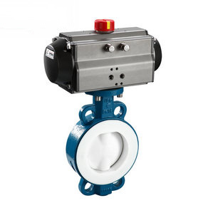 气动衬氟蝶阀又称气动衬里防腐蝶阀,是在会与管道介质接触的过流部件(如阀体内壁、蝶板、阀座)衬上一层较厚的氟塑料,具有超强的耐腐蚀性和耐磨性。气动衬氟蝶阀阀座与碟板全部由PTFE制作而成,有效的保证阀轴等相关部件不被阀腔内的介质接触而腐蚀。气动衬氟蝶阀按连接方式不同分为气动对夹式衬氟蝶阀和气动法兰衬氟蝶阀,也可以根据工况要求选用开关型或调节型的执行装置,达到对管路介质的快速切断或比例式调节流量使用,可广泛应用于温度≤180℃的腐蚀性流体以及强酸强碱等介质的常温常压场合。